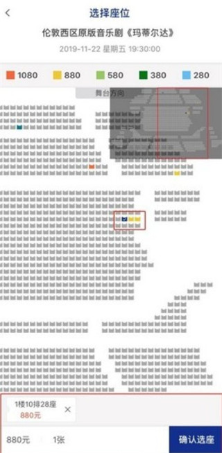 2、确认演出时间后点击“选座购买”进入到选择座位页面,选择座位后点击“确认选座”进入确认订单页面。