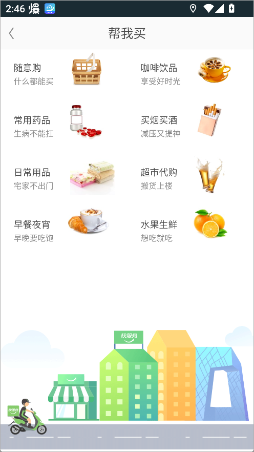 1. 同城代买:早餐、夜宵、水果、生鲜、药品、日用品,全城帮买,30分钟起送到手。