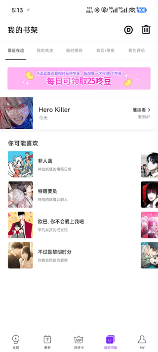 5、将正在追更的漫画加入【我的书架】,通过【最近在追】功能快速续读。还可以利用【购买/等免】分类,清晰地区分已购章节和待免费解锁的章节,让你的阅读更有条理。