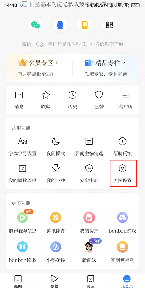 1、打开腾讯新闻App,点击“我的”->“设置”;