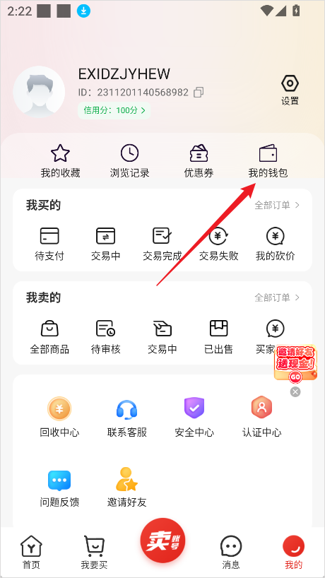 1、打开交易游App,在首页点击下方的【卖账号】;