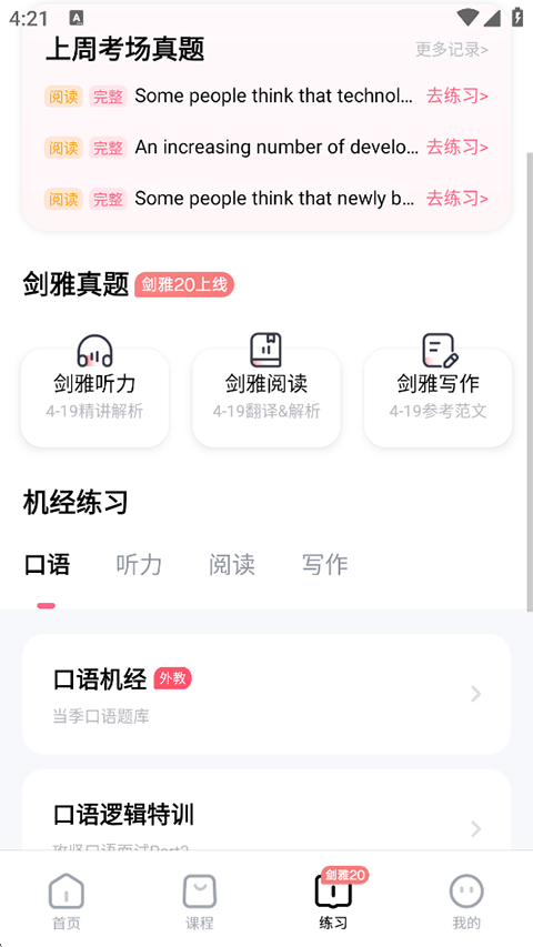 4. 听、读、写、口语练习库提供适合移动端的各类题型练习模式,并持续更新题库。