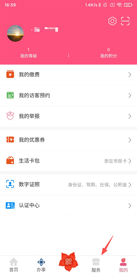 1、打开爱我崇左APP,注册登录后点击服务页;