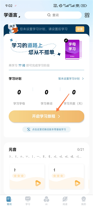 1、打开莱特韩语学习背单词,点击开始学习之旅