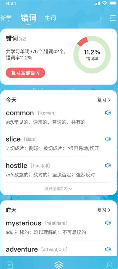 遇到记不住的单词,一键加入生词本;手机离线也能随时翻看,利用碎片时间反复记忆,加深印象。