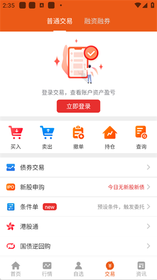 4、点击交易,里面提供了买入、卖出、撤单、持仓、查询、新股申购、国债逆回购等等功能;