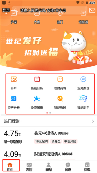 1、打开在本站下载的世纪招财猫app,点击进入首页,该板块为用户提供了开户、新股日历、业务办理、资产分析、智能选股、其他行情等等功能;