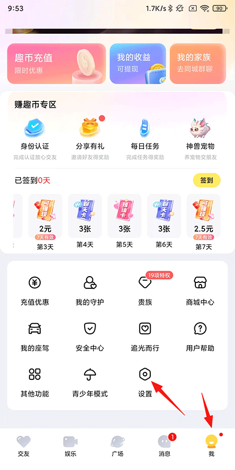 1、打开他趣APP,点击我的-设置;