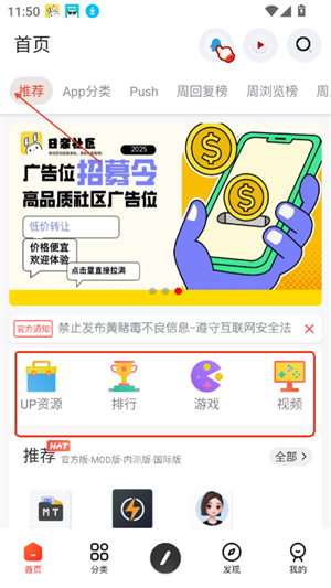 2、打开进入软件,在首页中可以查看推荐,或者筛选下方up资源,游戏,排行榜,视频等内容
