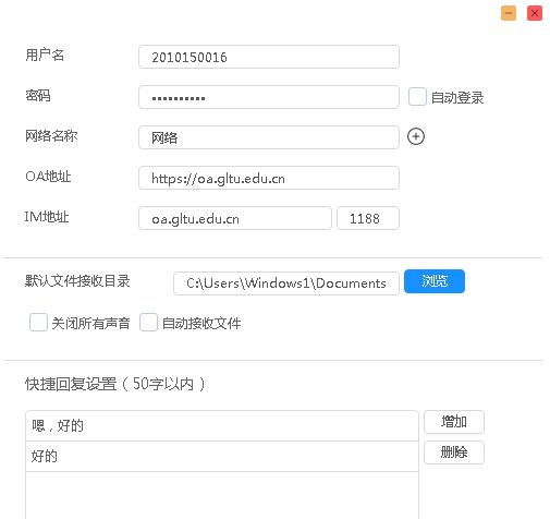 2、请在登录界面输入您的用户名和密码,点击OA地址栏右侧的齿轮形状按钮即可进入网络环境设置界面,设置您的网络地址如下图,设置完毕后退出;然后选择相应网络进行登陆。