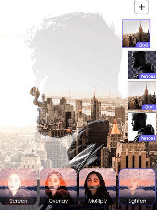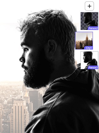 2、首先添加两张照片,人物为底图,城市为混合素材