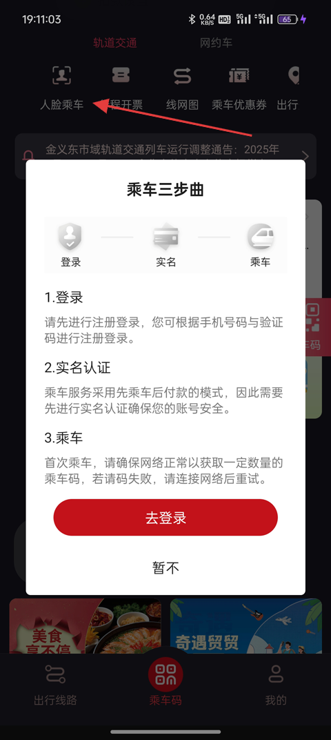 1、打开金轨智行App,点击底部“ 乘车码 ”;